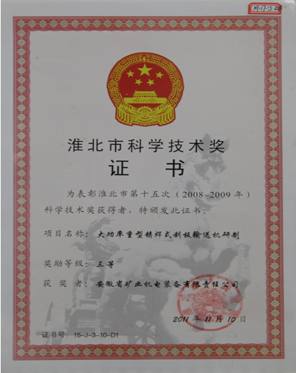 成功案(àn)例:公司研製的《SGZ1000/1400型刮板機》2011年被評為“淮北市科(kē)學技術獎三等獎”